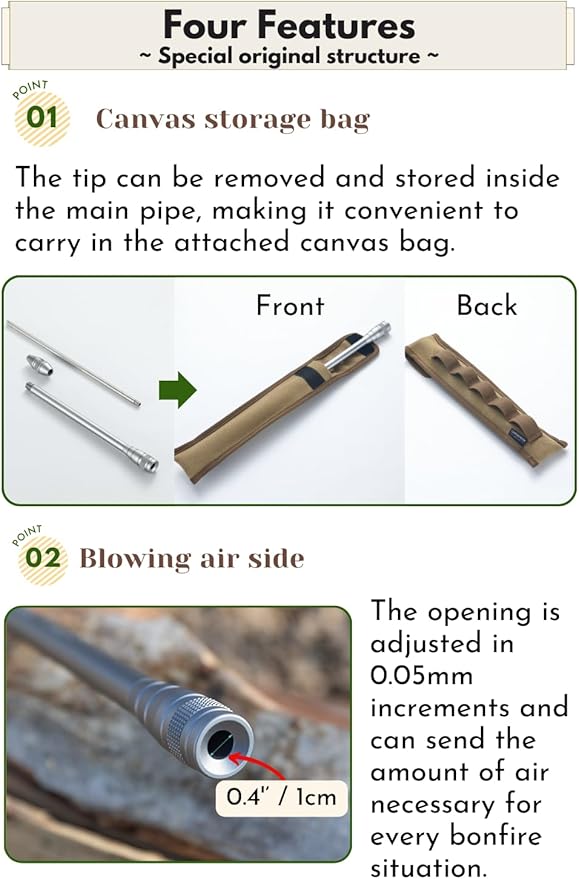 - 【Canvas storage bag】The tip can be removed and stored inside the main pipe, making it convenient to carry in the attached canvas bag.