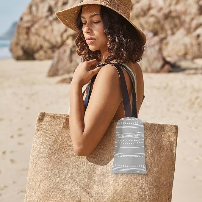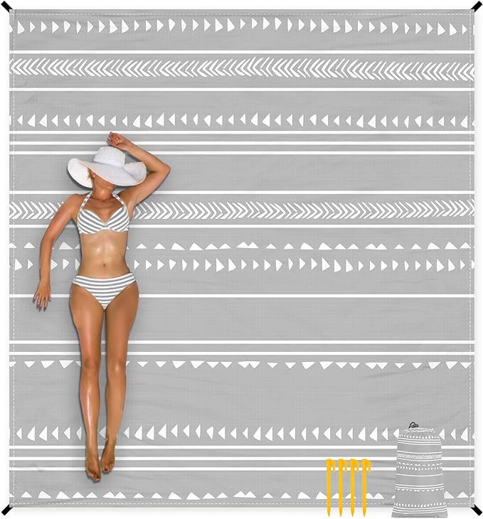 - Wind Resistant : Our gray geometric style beach blanket comes with 4 anchor stakes and 4 sand pockets. On windy days, if you don't have a lot of stuff on your beach mat, just fill the built-in corner pockets with sand to weigh it down or use the four included stakes to keep it in place.