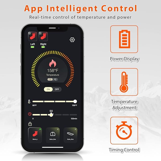 - 🔥APP Intelligent Control: MATKAO heated socks come with an exclusive APP. You can scan the QR code in the instruction manual or search for Q-thermo in the app store to download the app, which can accurately adjust the temperature, timing function and real-time power display. The temperature can be adjusted to any comfortable temperature from 86°F to 158°F; no need to bend over to find the switch in winter, allowing you to better enjoy the warmth brought by the heated socks.