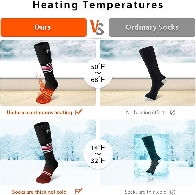 - 🔥Perfect Gift for Winter Activities: The rechargeable heated socks are suitable for various outdoor activities in winter, such as camping, hunting, hiking, skating, fishing, motorcycle, cycling, outdoor work, etc. Heated socks bring warmth to your loved ones, parents and friends. They are the perfect warm gifts for Thanksgiving, Christmas and Valentine's Day. Heated socks can also be used as Christmas stocking fillers!