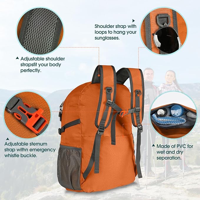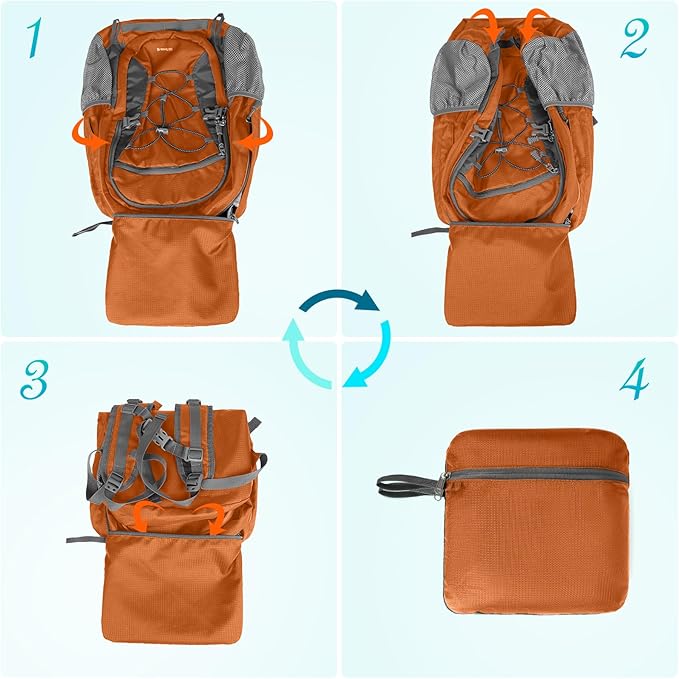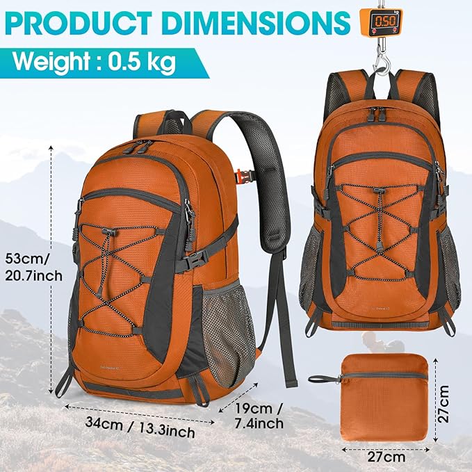- Compact and Comfortable: This hiking backpack can hold at most 40 litres of items, and its weight is only 1 pound. It can be folded and stored in a small pocket, you can unfold and enlarge it when in use. Surrounded by lots of mesh-like breathable sponges, this foldable backpack won't cause any fatigue while travelling. Besides, the adjustable chest belt could help you balance the load and keep it stable.
