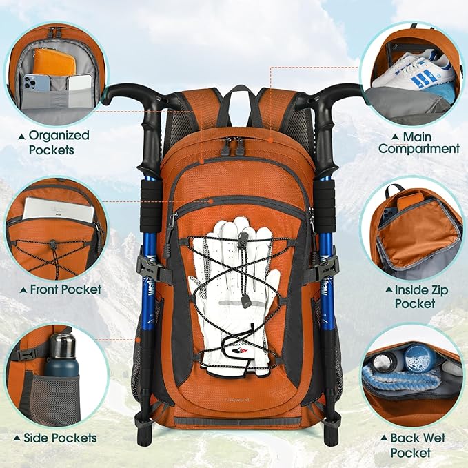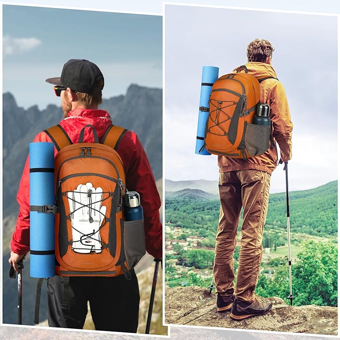 - Large Capacity: This camping backpack contains several compartments, which could hold more items and help you better organize them! Besides the main compartment, this travel daypack also contains 2 front pockets for cellphones and devices, 2 lateral mesh pockets for water bottles and folding umbrellas, and 1 inner pocket for purse and value! Great carry on backpack for outdoors and daily!