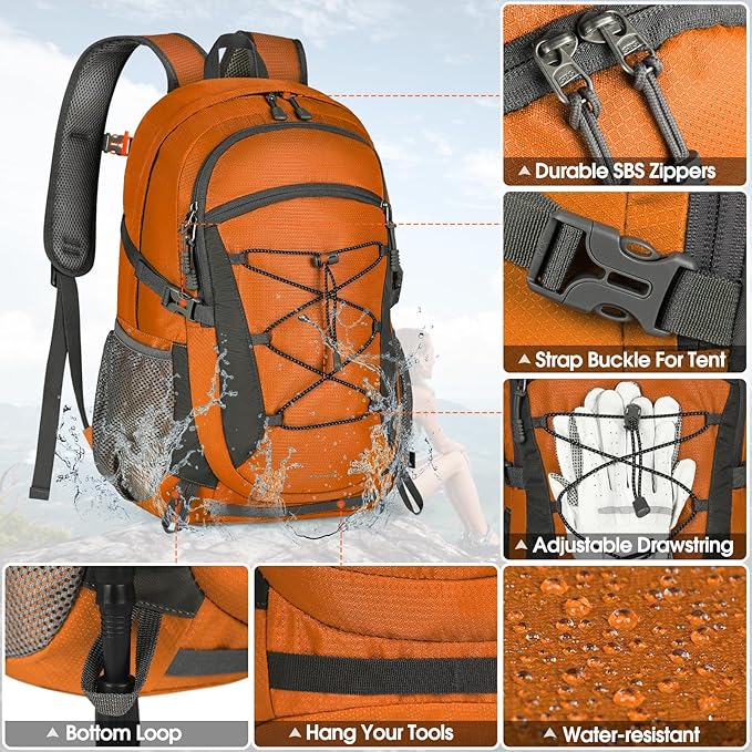 - Durable Material: This waterproof backpack is made of excellent rip-resistant and nylon fabric, which is more durable and can last longer. Deluxe SBS zippers with reinforced stitching at linkings offer this hiking daypack a better experience. Then the double-layer bottom could carry heavier items without worrying about tearing!