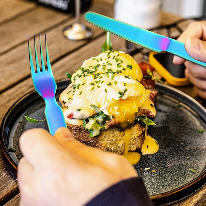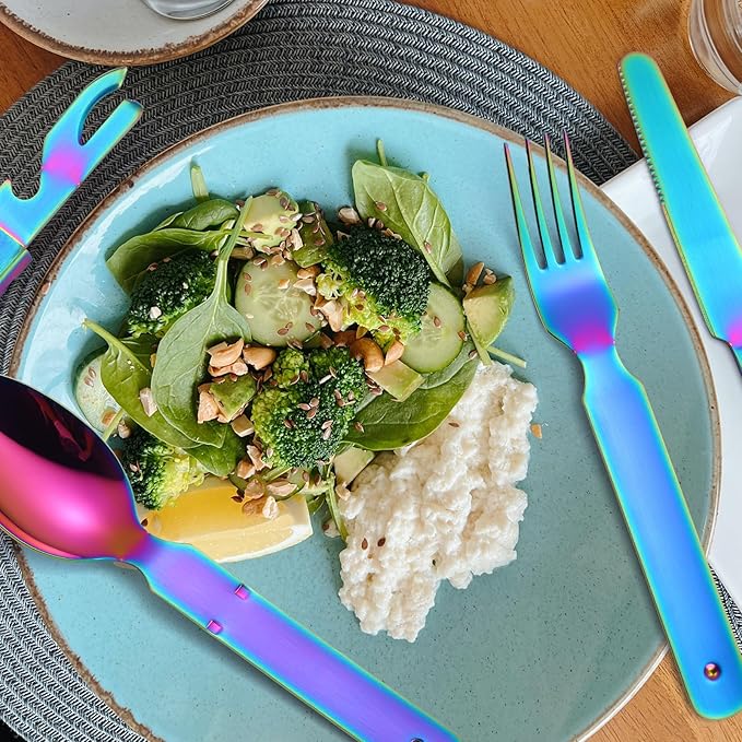 - COLORFUL: Add some fun and color to your camping meals with our Camping Rainbow Utensils Set. This set includes a fork, spoon, and knife, all in bright and vibrant colors to make dining outdoors even more enjoyable. A must-have for any camping enthusiast.