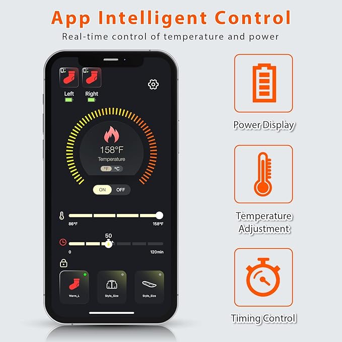 - APP Intelligent Control: MATKAO heated socks come with an exclusive APP. You can scan the QR code in the instruction manual or search for Q-thermo in the app store to download the app, which can accurately adjust the temperature, timing function and real-time power display. The temperature can be adjusted to any comfortable temperature from 86°F to 158°F; no need to bend over to find the switch in winter, allowing you to better enjoy the warmth brought by the heated socks