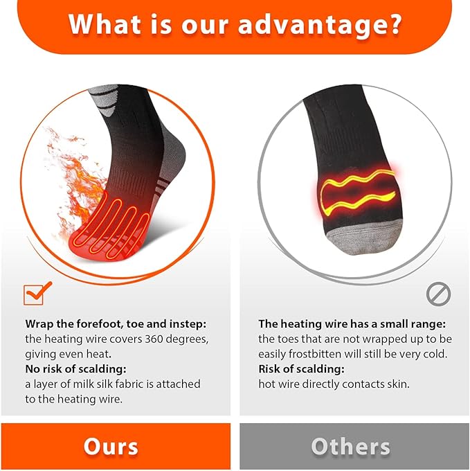 - 360°Warm Wrapping: Battery Heated socks can quickly and evenly heat your entire bottom of foot, toes and back of foot, effectively helping you improve blood circulation and reduce cold feet. The heating socks have a thick and soft design with heating wires embedded in the fabric, evenly distributed in the toes and front foot. They integrate with thermal socks and will not make you feel uncomfortable