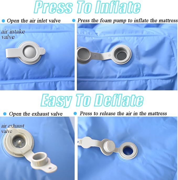 - 【EASY TO INFLATE/DEFLATE】Each double wide sleeping pad mattress has 2 valves, one for easy inflation with your feet or hands (no pump required) and the other for quick inflation and deflation