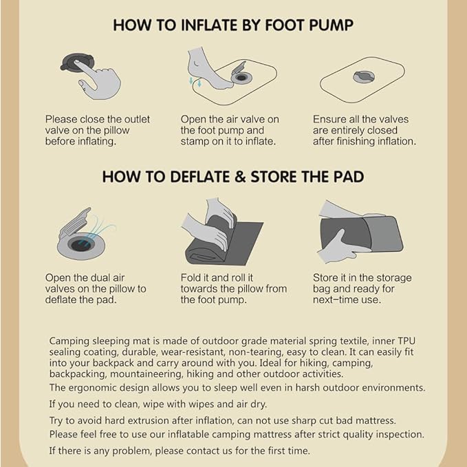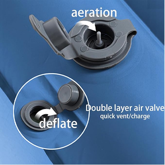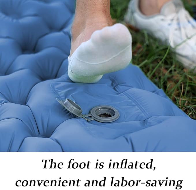 - 【Only 30 Seconds to Inflate and Quickly Deflate】- Upgraded presser foot sleeping pad, no longer inflate with mouth, hand or carry pump, just step on the air intake at the bottom of the sleeping pad to inflate in just 30 seconds. See , the perfect camping mat to start your adventure. The latest single-layer vent valve design, just open the vent plug, and it only takes 1 second to achieve ultra-fast venting.