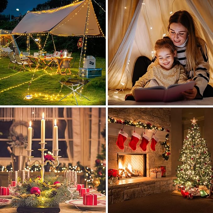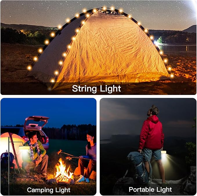 - 🌞【2024 Upgraded Camping String Light】The camping light and atmosphere light are cleverly combined, with a 2-in-1 design that allows them to not only serve as camping lighting, emergency lighting, flashlights, distress signal lights, but also 33FT light strings for home decoration, tent decoration, birthday and holiday decorations, creating a variety of comfortable and romantic atmospheres.