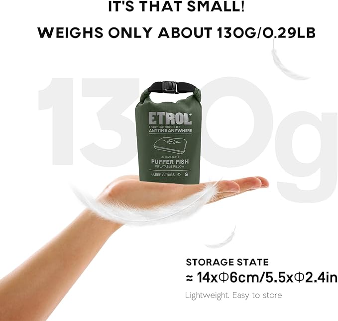 - ULTRA LIGHT & PORTABLE - The lightweight Travel Pillow weighs only 130g/4.6oz, Lighter than a bottle of water. With storage size of 14x6cm/5.5x2.4in, the Pillow fits easily in the palm of your hand and occupies only a small corner of your backpack, so you can't feel its presence when not in use.