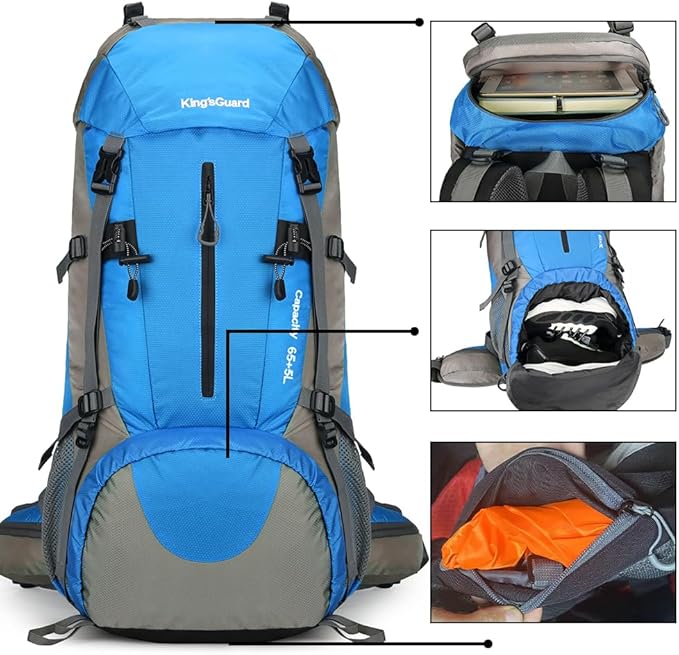 King'sGuard 70L Hiking Backpack Waterproof Camping Backpack with Rain Cover Large Lightweight Backpacking Backpack Daypack for Travel Outdoor -Frameless (Light Blue)