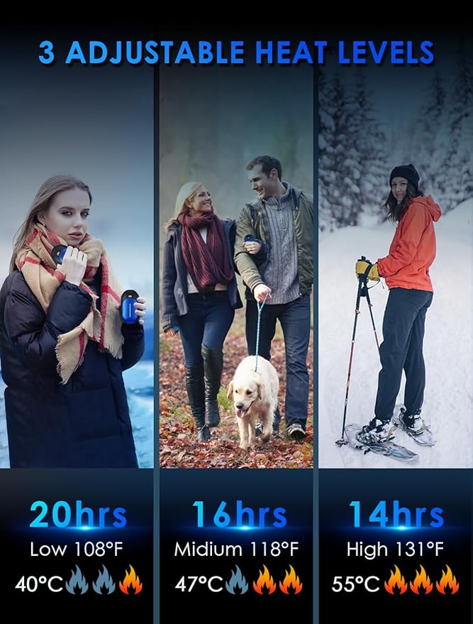 - FAST HEATING & 3 LEVELS - To stable and safe heating, We only use premium chipset to control the heat levels. With a 20% increase in power density, only 2 seconds, our reusable hand warmer can quickly heats up to 95℉.3 levels of temperatures 95-107°F/104-118°F/118-131°F at your choice.