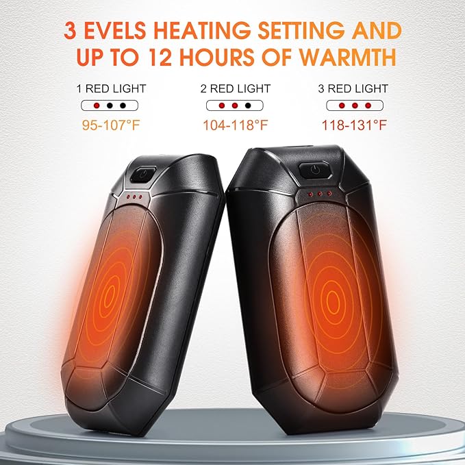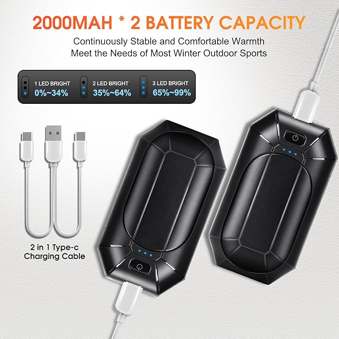 - Instant and safe heating no longer need to wait for a long time, the 2000mAh*2 battery capacity of the mini hand warmer is enough to meet the needs of most winter outdoor sports. One full charge can last up to 12 hours of continuous use, 3-level temperature settings for adjustable, precise, stable and comfortable warmth, 3-level indicator light lets you know the remaining power and heating status.