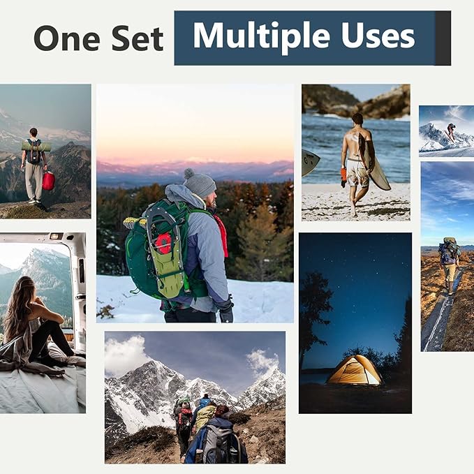 - MULTIPURPOSE: This dry bag set is ideal for various outdoor activities, including backpacking, hiking, kayaking, boating, camping, cycle touring, travel, and more.