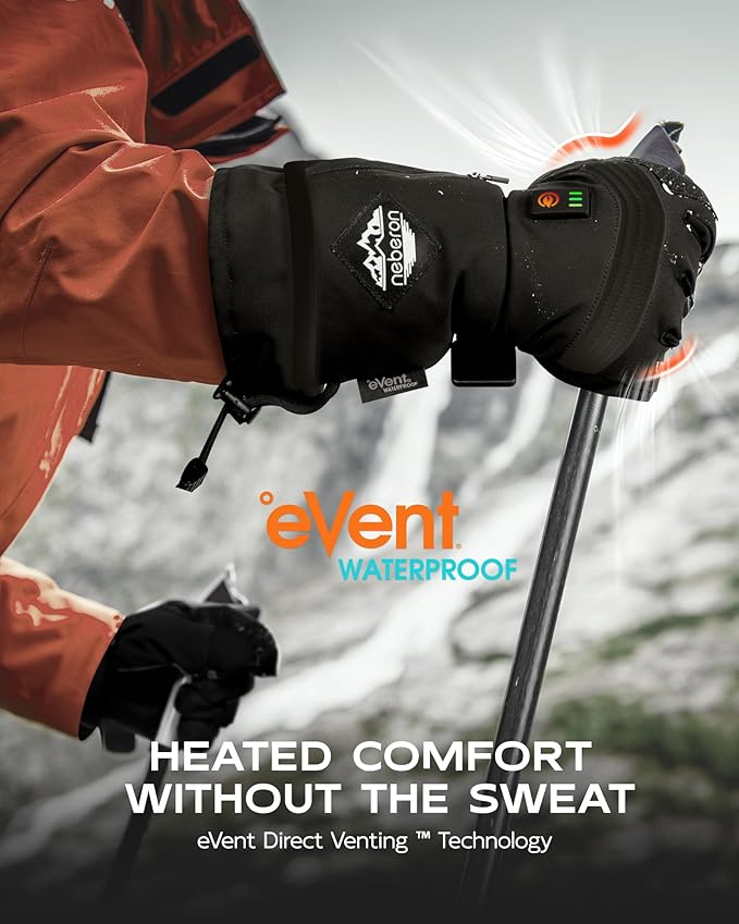 - [Superior Waterproof & Breathable with eVent] Neberon Heated Gloves feature the unique eVent material, which surpasses other materials in terms of waterproofing and breathability, providing optimal comfort. Whether you're an outdoor enthusiast, winter sports lover, outdoor worker, or simply someone who dislikes cold hands, our heated gloves are here to change the game. Keep your hands warm and comfortable during activities in cold weather.