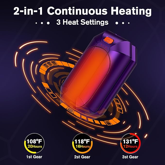 - π§γ2s Fast Heating Hand WarmerγThe hand warmer can heat up very quickly, with the fastest time reaching 3 seconds. The hand warmer will make your hands feel warm quickly in cold winter. The hand warmer can adjust the temperature independently, and each separate half provides 3levels of adjustable temperature (40Β°C/48Β°C/55Β°C)to fully meet your different needs. The hand warmer provides heat for a long time, up to 15 hours, so you don't have to worry about your hands getting cold.