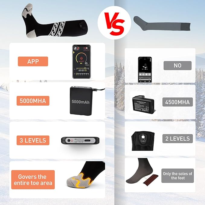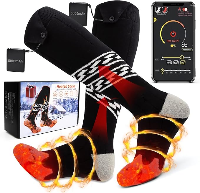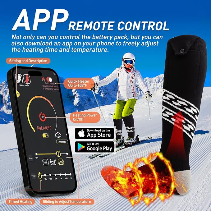 - APP Control + Battery Control:Heated socks with app control or Button Control.Electric socks are equipped with a smart APP,You Can download the app then control the socks via your mobile heated socks,You no longer need to take off your boots and bend down to find the button hidden in the sock to turn off the electric heating socks, which will make your winter activities and work more convenient. you can control the socks through the battery button when the phone is not with you.