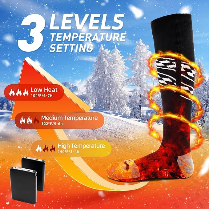 - 3 Heating Levels & 3 Temperature Settings: Our electric heated socks have 3 heating levels (high: 140°F/60°C, medium: 122°F/50°C, low: 104°F/40°C) and 3 temperature settings. You can choose the suitable temperature according to the weather or your own needs