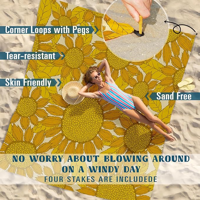 - 🍃BIG BEACH BLANKET:Package includes 1 carabiner,4 ground stakes for 4 anchor loops,to keep it from blowing around on the beach.Perfect for outdoor uses,it will remain secure and stable on windy days.