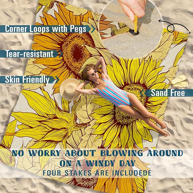 - 🍃BIG BEACH BLANKET:Package includes 1 carabiner,4 ground stakes for 4 anchor loops,to keep it from blowing around on the beach.Perfect for outdoor uses,it will remain secure and stable on windy days.