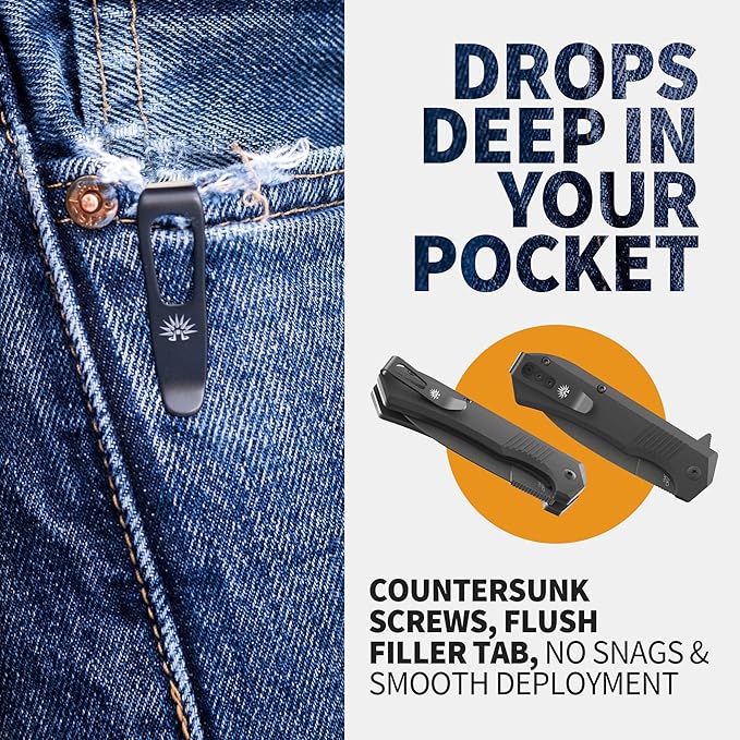 - ♨️DROPS DEEP IN YOUR POCKET: The pocket clip is deep; this knife will ride low in your pocket but is always ready for quick deployment. We made the screws on the clip flush with the handle, easy in and out of the pocket, no snags. Also, after many requests, we added a G10 filler piece on the left carry side to keep the scales flush and smooth. **PRO TIP: Check out the Off-Grid Knives BULLET torx tool on Amazon.