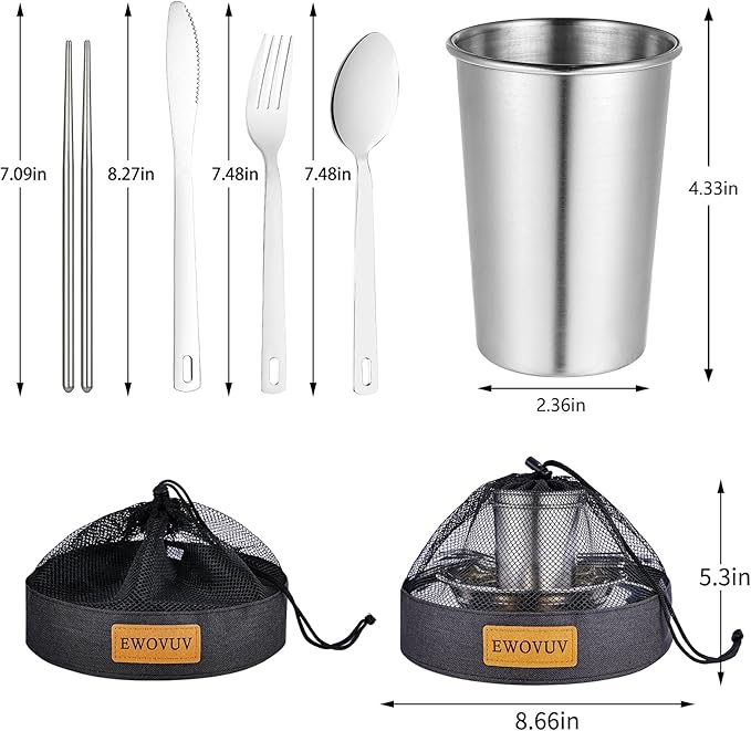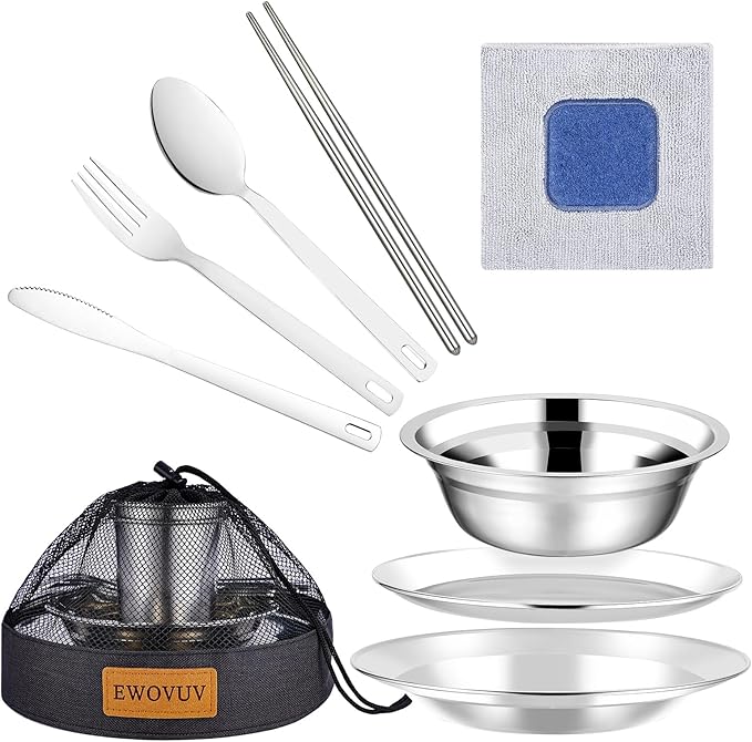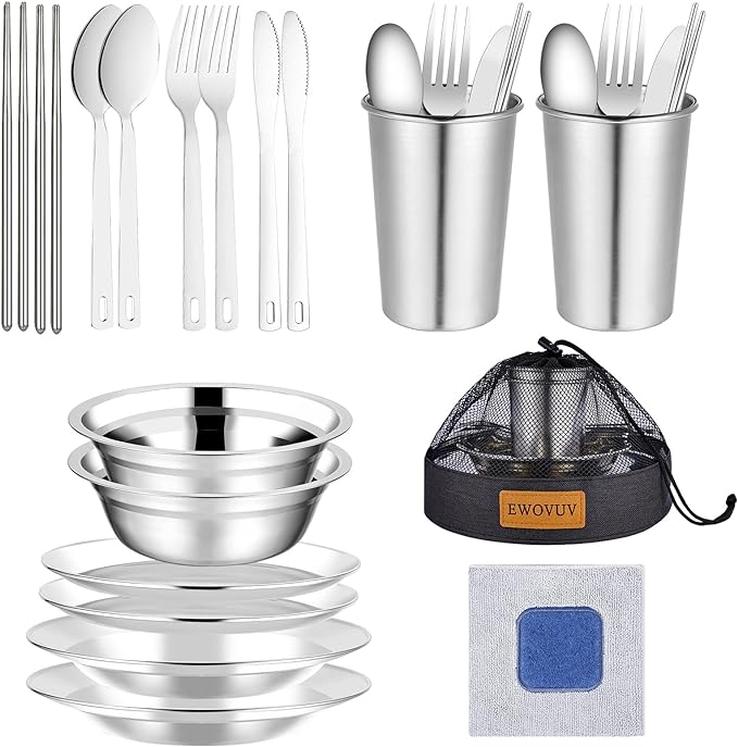 - EWOVUV Double Cutlery Set includes 8.5" Dinner Plates *2+ 8" BBQ Plates *2+ 10 oz Cups *2 + 6" Bowls *2 + 7" Spoons *2+ 7" Forks *2 + 7" Knives *2+ 7" Chopsticks *2 Towels *1 Mesh Bag.