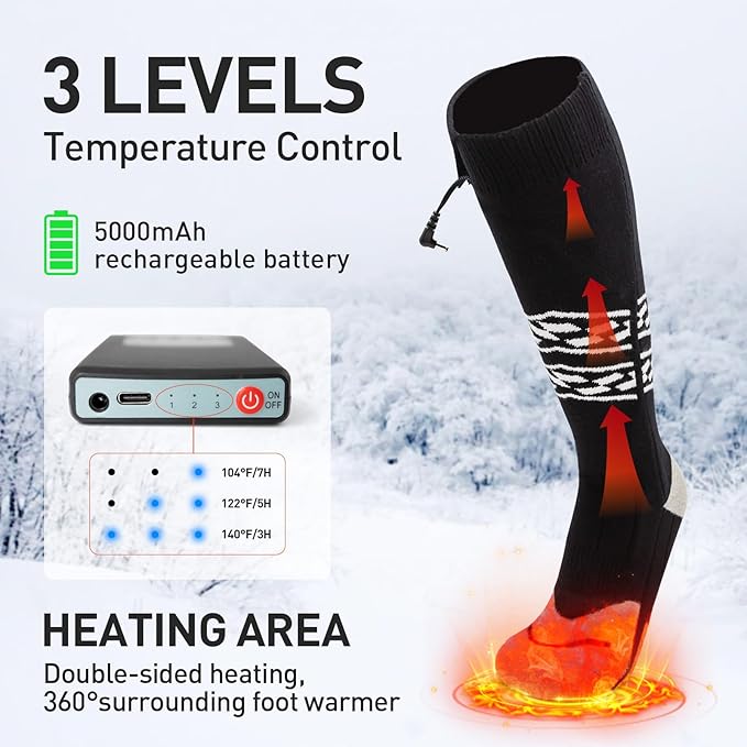 - 【3Heating Settings】 - Our electric socks have 3 heating levels (High: 140°F/60°C; Medium: 122°F/50°C; Low: 104°F/40°C). You can choose the right temperature according to the weather or your needs. Making the heated socks ideal for keeping your feet warm in winter.Men's and women's heated socks are perfect for hunting, fishing, camping, hiking and working outdoors. Especially for outdoor activities like snow and skiing in winter, these electric socks can protect your entire frozen toes.