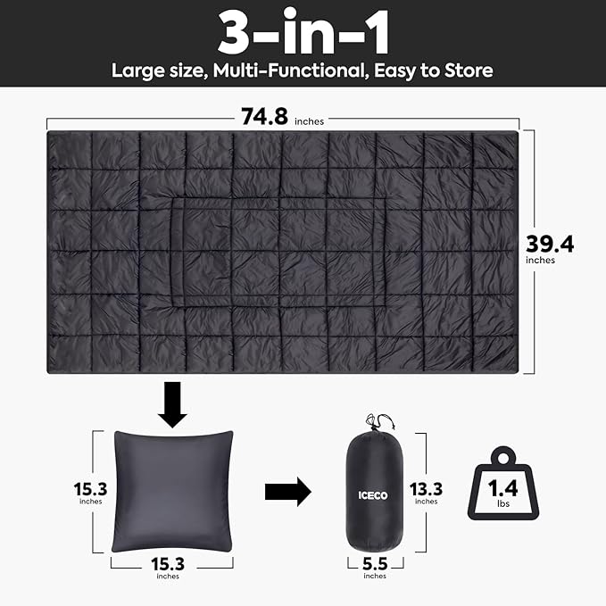- Multi-functional Design -The buckle design on this ICECO outdoor blanket makes it easy to fall off when you drape it on your body; the strip buckle around the blanket can be used with ICECO Camping Cot; when you don't use it, it can even be stored and turned into a square pillow.