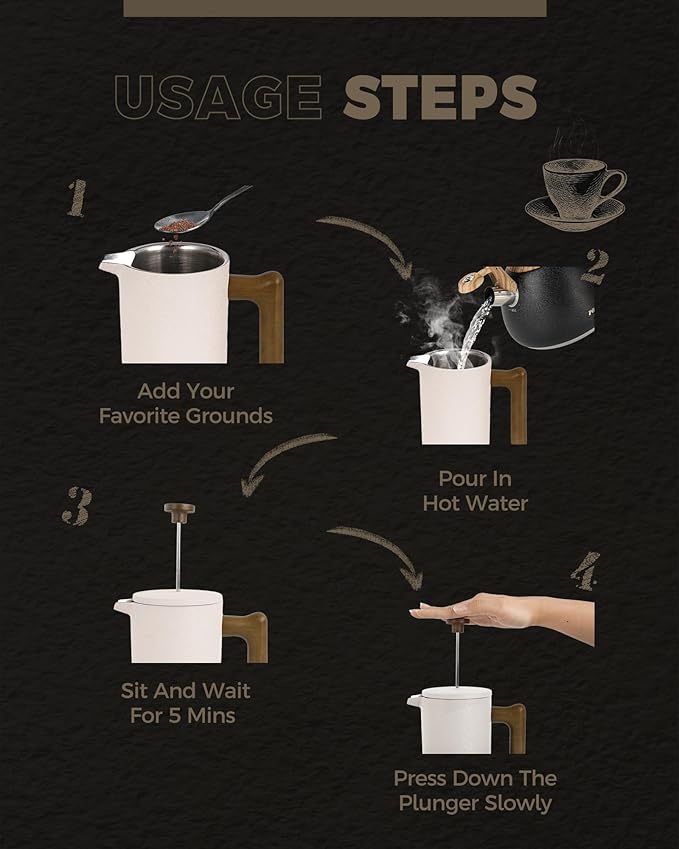 - LOOKING FOR COFFEE PRESS FOR MATCHING UP YOUR KITCHEN? We, the POLIVIAR french press coffee maker will be your smart choice. While the coffee pot is made from food grade stainless steel with stylish long-lasting coating, It is easily to match up your kitchenwares and your kitchen's theme. Also, the ergonomic handle with real wood will maximize the fantastic time of grounds you loved.