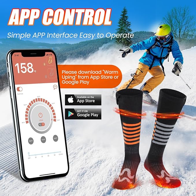 - 🔥【Upgraded APP & Button Control】The electric socks feature a user-friendly button control placed conveniently on the side of the socks, simply press the button and you can switch the heating level. For more convenient control, the socks are designed with App control. You can effortlessly turn on/off, switch heat settings, and set timed heating on the APP. Stay warm and in control with ease.