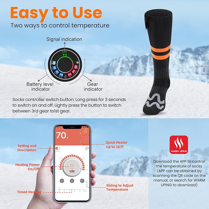 - 🔥【Heated Socks with APP】Our electric heated socks use a new type of heating sheet,which is scattered in the fabric and covers the whole toe area. Heating sheet blending in with the socks and almost not feeling its presence.The design of heating sheet makes your socks heat up evenly and gives your feet enough warmth.The electric socks can be not only controlled by the rechargeable battery button but also smart APP--WARM UPING.You can set heating temperature and timing on APP.