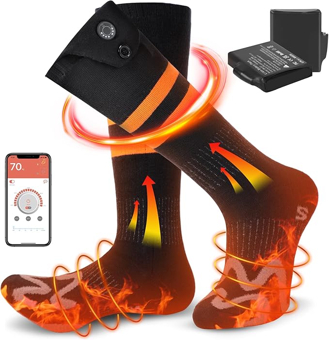 - 🔥【Heated Socks with APP】Our electric heated socks use a new type of heating sheet,which is scattered in the fabric and covers the whole toe area. Heating sheet blending in with the socks and almost not feeling its presence.The design of heating sheet makes your socks heat up evenly and gives your feet enough warmth.The electric socks can be not only controlled by the rechargeable battery button but also smart APP--WARM UPING.You can set heating temperature and timing on APP.