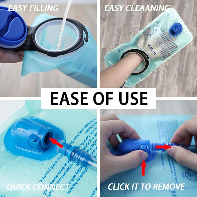 - LARGE-DIAMETER OPENING DESIGN : HEIKLN 2l hydration bladder has one of large opening, and the big opening makes for easy pouring of water. It is also fairly wide for a hand or bottle brush easily access to the interior water bladder. The screw on cap goes on and off easily. For cold water, simply add ice cubes directly from a scoop or refrigerator ice dispenser. The smooth inner of water reservoir promotes health and is easy to clean.