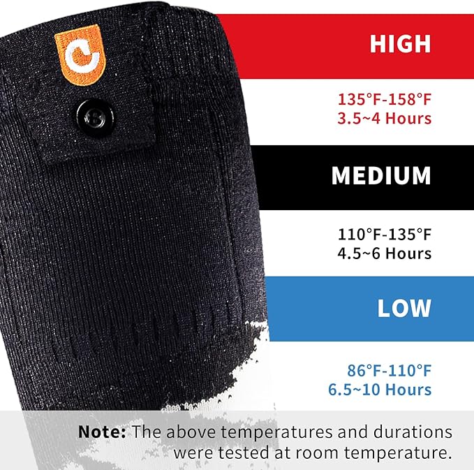 - 5000mAh Battery: Upgraded 5000mAh large capacity rechargeable battery, provide more than 12 hours of heat time for men’s heated socks and about 10 hours for women’s heated socks, please charge it fully before first using it