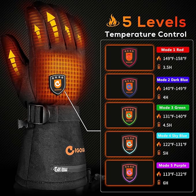 - OIGOGOI - Safer & Longer: OIGOGOI 7.4V 3000mAh rechargeable lithium battery enables the gloves to provide up to 8 hours of warmth on a low battery (full charge). The rechargeable hand warmers have overheat protection and come with UL,FCC,RoHS,CE certified batteries to keep you warmer and safer at the same time