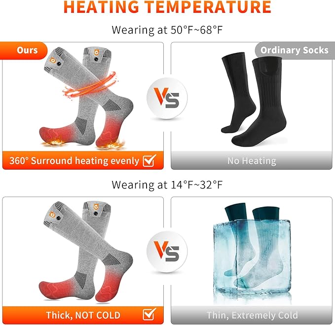 - High Quality Warm Fabric: Heating socks are designed with 4 layers of fabric, the electric heating wire is hidden in the fabric and integrated with the socks, 360° wrapping the foot area, no foreign body feeling and comfortable to wear. Surround heating to make your feet and even your whole body maintain warmth. The battery sock fabric is also very flexible and long enough.