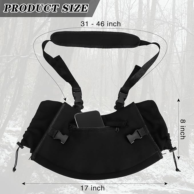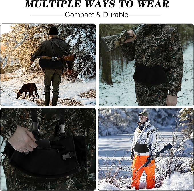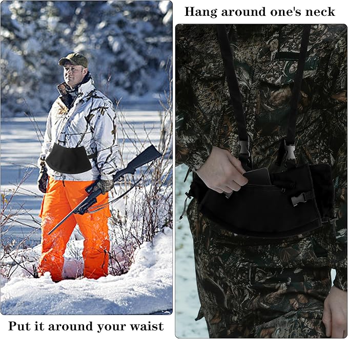 - Adjustable Straps: An adjustable strap with a buckle on our insulated hand muff warmers provides a secure and snug comfort. You can wear the hand muff around your neck or around your waist depending on your daily needs.The hunting hand muffs have elasticized ends so that hands can slip in and out of the muff with little or no noise. The elastic around the edges also keeps the warmth in and the snow and cold out