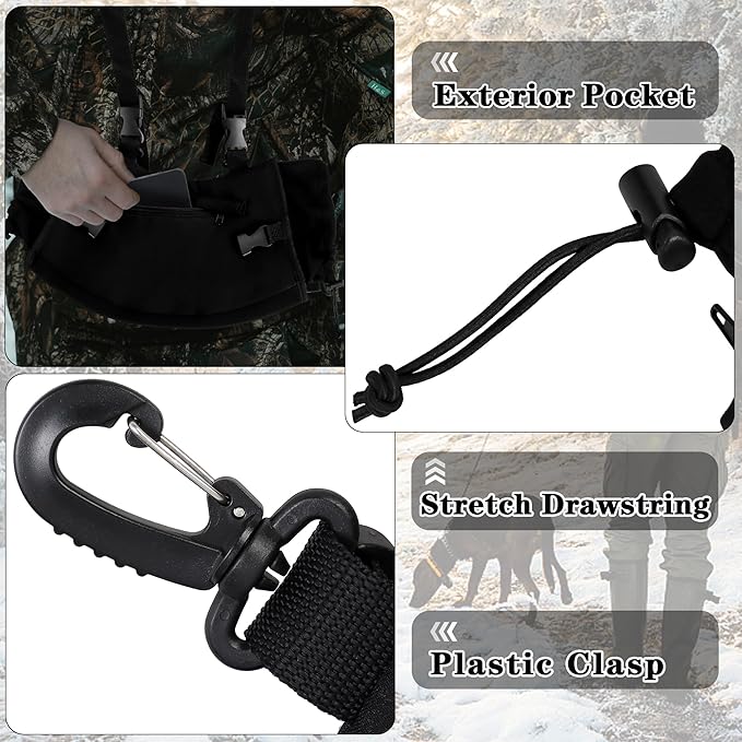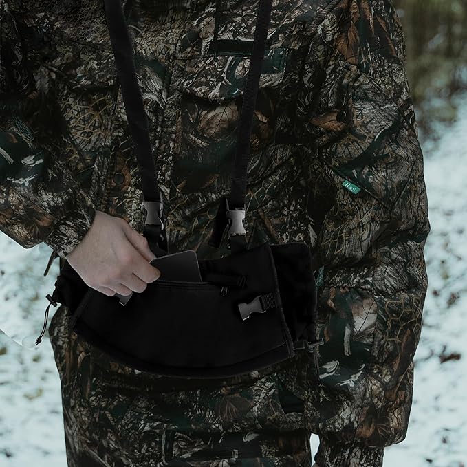 - Reasonable Design: The black pattern can blend into your forest surroundings, the camouflages into your hunting surroundings and seasons to stay concealed. Equipped with a storage pocket on the front, which can be used to store phones, gadgets, small equipment, keys, phone, or snacks