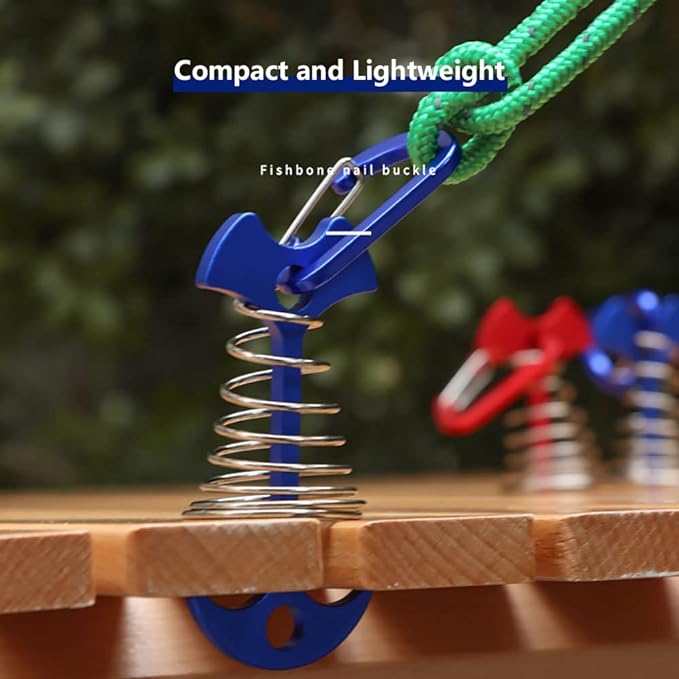- Quality Material: These spring tent rope tighteners are made of high strength aluminum alloy and stainless steel. Strong and durable, they will not rust or deform. Each deck anchor pegs are equipped with a D shape buckle to fit various sizes of ropes.