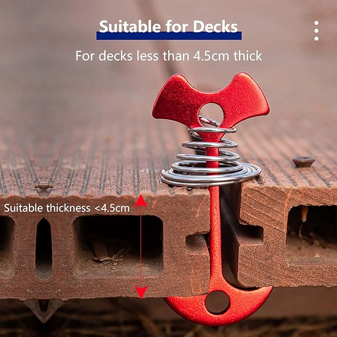 - Easy to Use: The unique fishbone design for boards and decks is very easy to use. Simply insert the fishbone pegs into the seams of the boards and rotate them to securely hold the tent without the need for holes. The stainless steel spring reinforcement also makes your tent more stable.