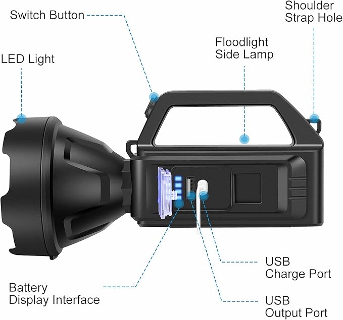 - 【USB Rechargeable & Power Display】USB Rechargeable spotlight equipped with power display and USB output port. You can see the power at a glance no more guessing the remaining power of flashlight. It is also a backup power source for mobile phone, charge your device easily in case of emergency.
