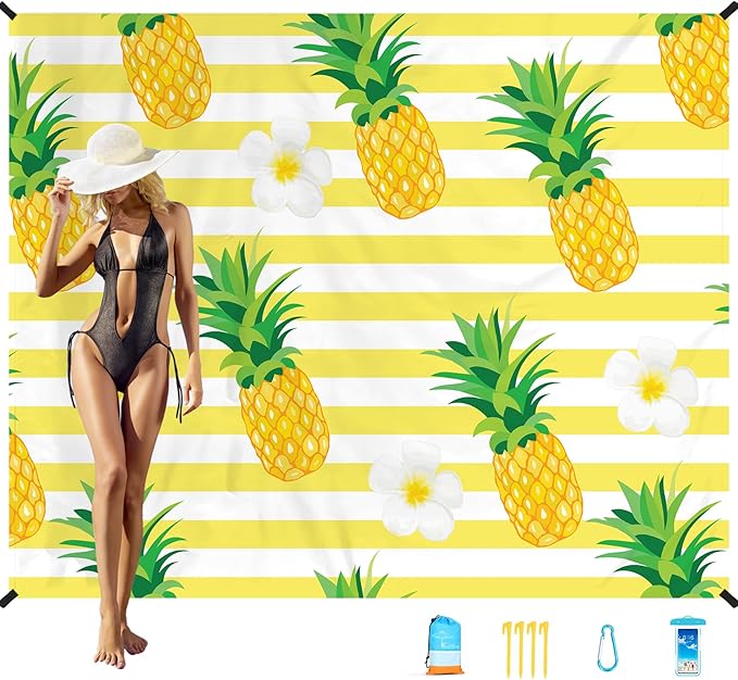 - Oversized Beach Picnic Mat:Package includes 4 ground stakes,1 carabiner,Keep out the wind because fixed With 4 fixed anchors,For vacation, hiking, or family garden parties.
