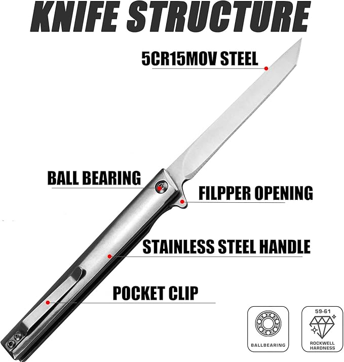 - SHARP AND DURABLE: This pocket knife blade is made of 5Cr15Mov steel which provide high hardness and toughness. Cutting also has a very excellent performance. The handle with high quality stainless steel.