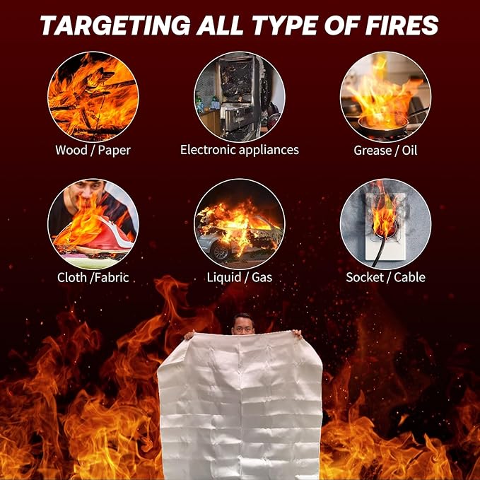 - All Types of Fires: The fire protection blanket can put out almost all types of fires, including electrical, cooking oil, textiles, petrol/diesel, paper/card, motor oil, and bio-ethanol. A must have in your kitchen, backyard and vehicle survival kit for protection.