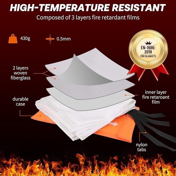 - High-Temperature Resistant: The fire suppression blanket can extinguish the fire source promptly in case of a sudden fire. It can isolate high temperatures up to 1076℉( 580℃), thanks to it's Composed of two layers of 100% flame retardant woven fiberglass fabric and an inner layer of fire retardant film, meets safety blanket standards set by CE and SGS.