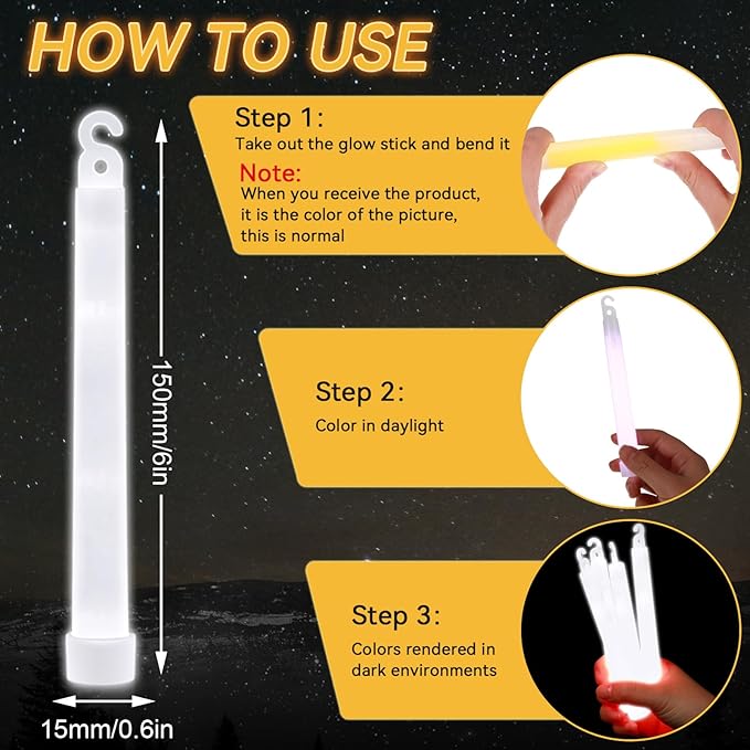 - Multipurpose Utility: glow in the dark sticks are versatile, ideal for numerous indoor and outdoor activities; They are suitable for camping, hiking, emergency situations, parties, concerts, and more, which can be markers or signal devices in low light conditions, contributing to safety during outdoor adventures