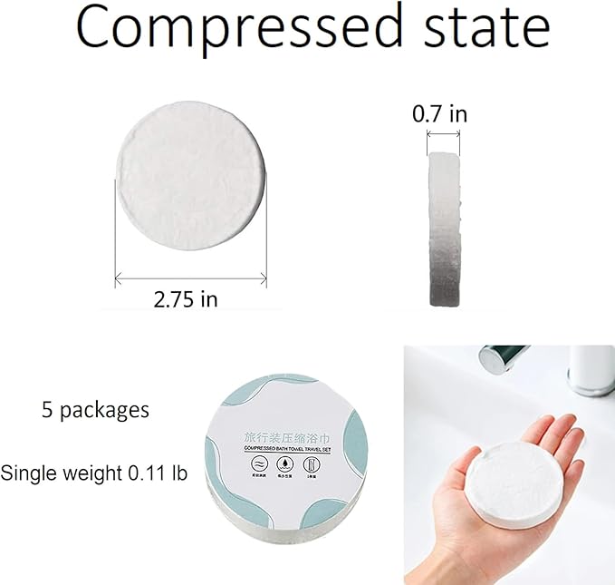 - Disposable large compressed bath towel tablets:Packaging includes 5 pieces expandable compressed towel,using outdoors and indoors.original size: diameter 2.75 inch.put it in water for several seconds.it will be expansile and become a large towel,ampliative size:approx 42 x 27 inch.