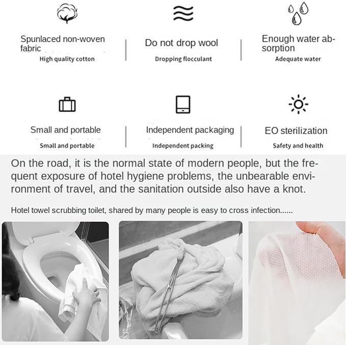 - Made of 99.99% cotton,individually wrapped and easy to carry.travel towels to avoid using shared towels in hotels.these disposable towels for travel occupy no space in your bags,car,suitcases.great for travel,outdoors,emergencies,camping,swim,mountaineering,also can used for office,school,hotel,home and more.