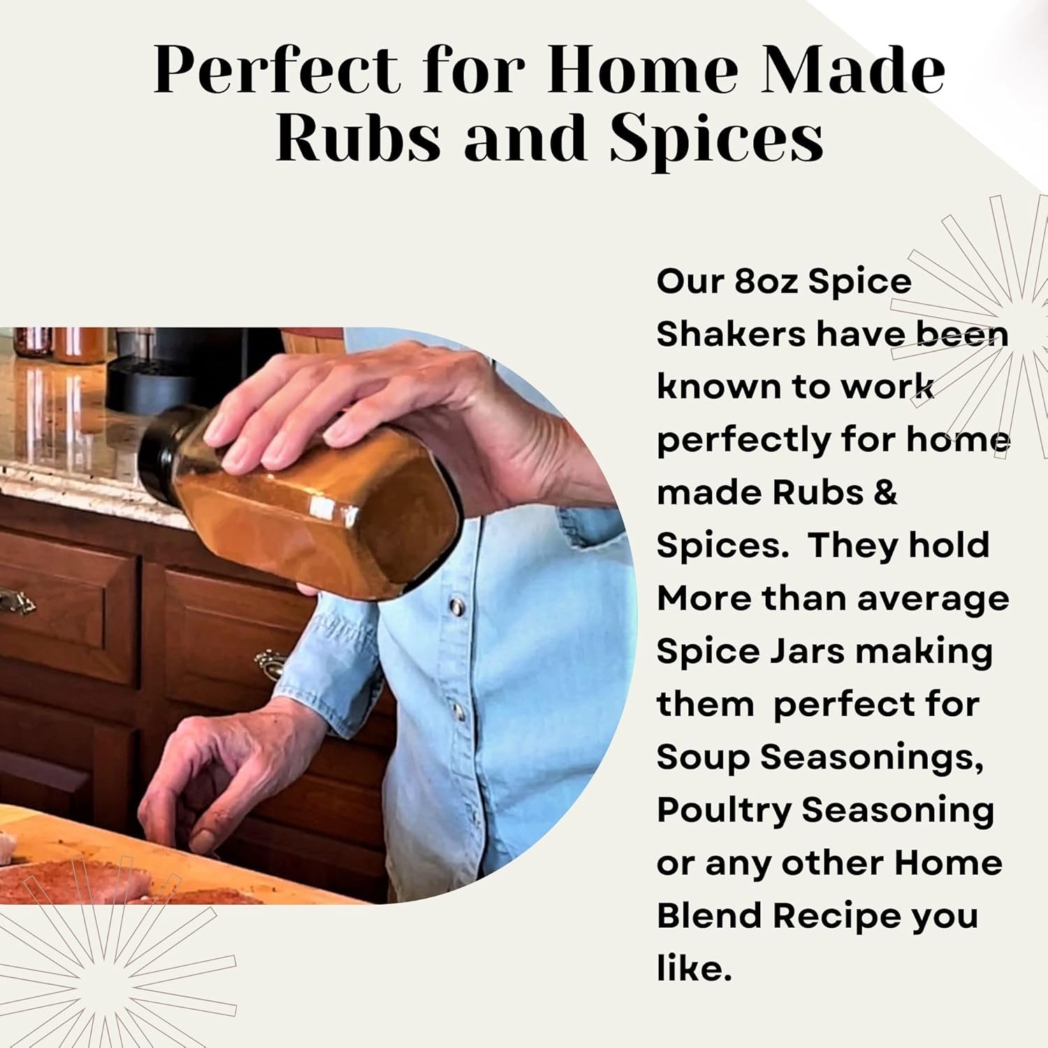 - VERSATILE HOME ESSENTIALS: Our Glass Spice Jars with Shaker Lids are modern, minimalist home must-haves you can use for home canning various Kitchen essentials like food, condiment, spices, herb, coffee, powder, and salt. These bottles also store small things like buttons, pins, marbles, beads, sand, and more.