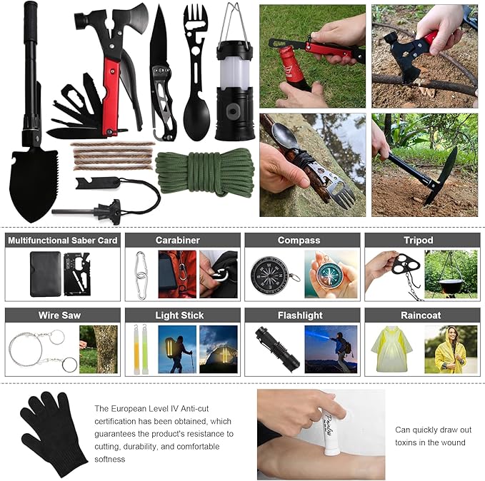 - Camping Essentials: This survival tool kit is currently the most comprehensive, multifunctional, and abundant outdoor first aid kit on the market, covering a wide range of scenarios. It includes a multi-functional axe, a straw-type water purifier, a tripod for campfires, a vacuum poison extractor, and more, providing a complete set of tools. It also has the ability to quickly set up two temporary shelters or temporary medical stations, offering protection against wind, rain, and insulation.
